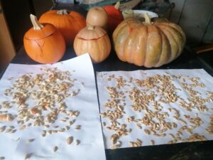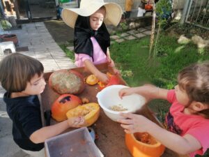 Ikasle batzuk, kalabazak hustu eta haziak atera dizkiete kalabazei, datorren urtean ere hauekin lan egin ahal izateko.